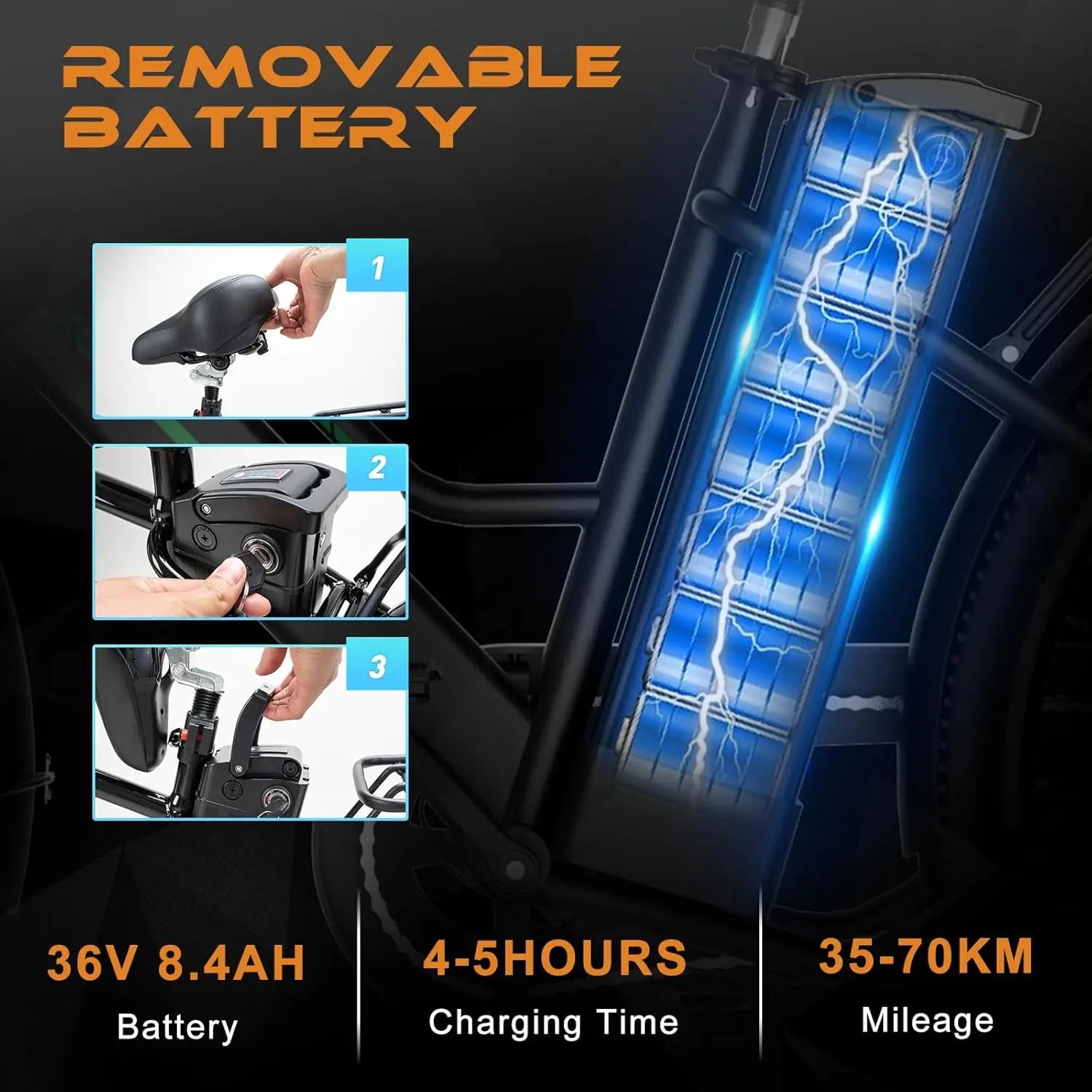 Removable battery: The strong point of the e-bike is our removable 8.4 AH lithium-ion battery, which can be recharged separately and is easy to carry. The battery comes with a separate mechanical Anti-theft device and a battery key. The battery charging time is 4-5 hours