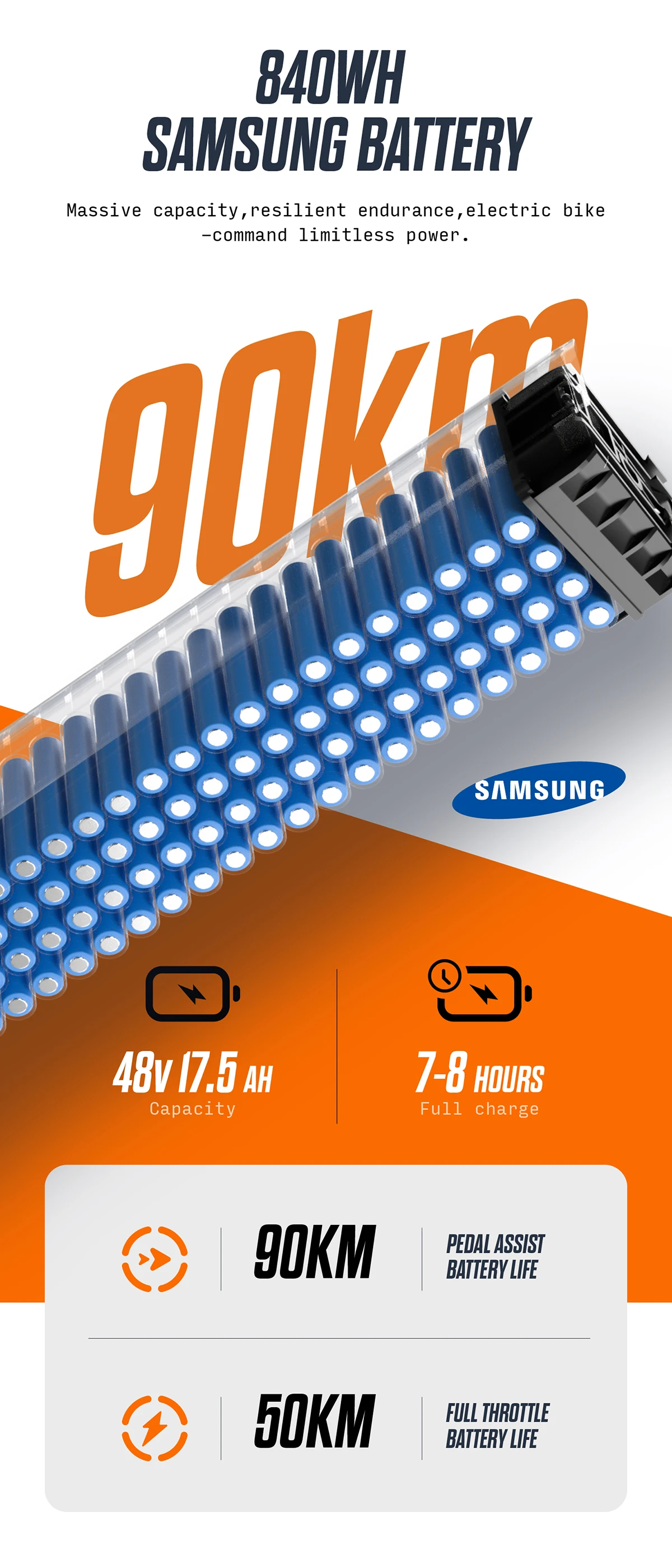 👏【Large Capacity Battery】Our electric bike is equipped with Samsung battery 840WH(48V 17.5Ah). High-performance battery, stable and strong output, fully charged in 5-6 hours. The internal battery is integrated into the down tube, perfectly harmonizing with the frame design. For those looking for a stylish, high-performance e-bike, the Ebike MX06 e-bike is a great choice for everyday use and commuting to work.
